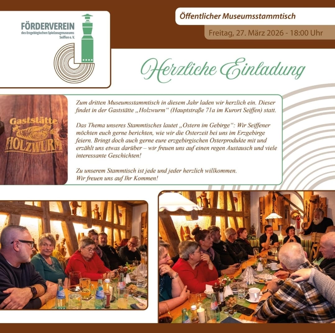 Zum dritten Museumsstammtisch in diesem Jahr laden wir herzlich ein. Dieser findet am Freitag, den 27. März 2026, ab 18:00 Uhr, in der Gaststätte „Holzwurm“ (Hauptstraße 71a im Kurort Seiffen) statt.